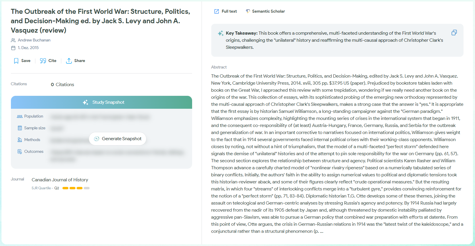 In diesem Fall sind weder Christopher Clark, Herfried Münkler noch Sönke Neitzel als Standardreferenzen zum Thema Erster Weltkrieg abrufbar – die Argumentation verliert damit an Bezug zum aktuellen wissenschaftlichen Diskurs. Dennoch: Für viele Fächer und Themenbereiche kann gerade dieser Zugriff auf 200 Millionen papers besonders interessant sein. Denn so werden zahllose Studien (Naturwissenschaften, Psychologie, Pädagogik etc.) für die textbezogene Recherche überhaupt erst zugänglich.