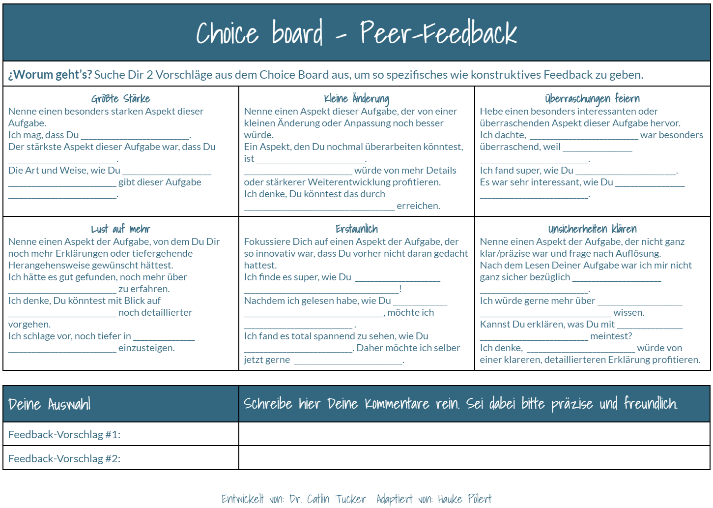 Soll gegenseitiges Feedback in digitalen Lernumgebungen zur Selbstverständlichkeit werden, ist der Fokus auf positive Verstärkung genauso wie sensible Sprachkorrektur ein zentrales Lernfeld für alle Beteiligten. Angesichts der zumeist gegebenen Einsehbarkeit von Peer-Kommentaren (wie in Padlet oder TaskCards) für die gesamte Lerngruppe, sollten methodische Hinweise, Regeln oder Unterstützungsmaterialien (wie das Praxisbeispiel für ein Feedback-Choice-Board mit Formulierungshilfen zeigt) die Lernenden in dieser Phase begleiten. Der Vorteil dieses choice boards als Google Doc ist natürlich, dass es beliebig angepasst werden kann. So sind problemlos Kürzungen, Ergänzungen oder auch die zielsprachige Nutzung im Fremdsprachenunterricht (hier dient das choice board dann auch als zielsprachige Kommunikationsgrundlage) möglich.