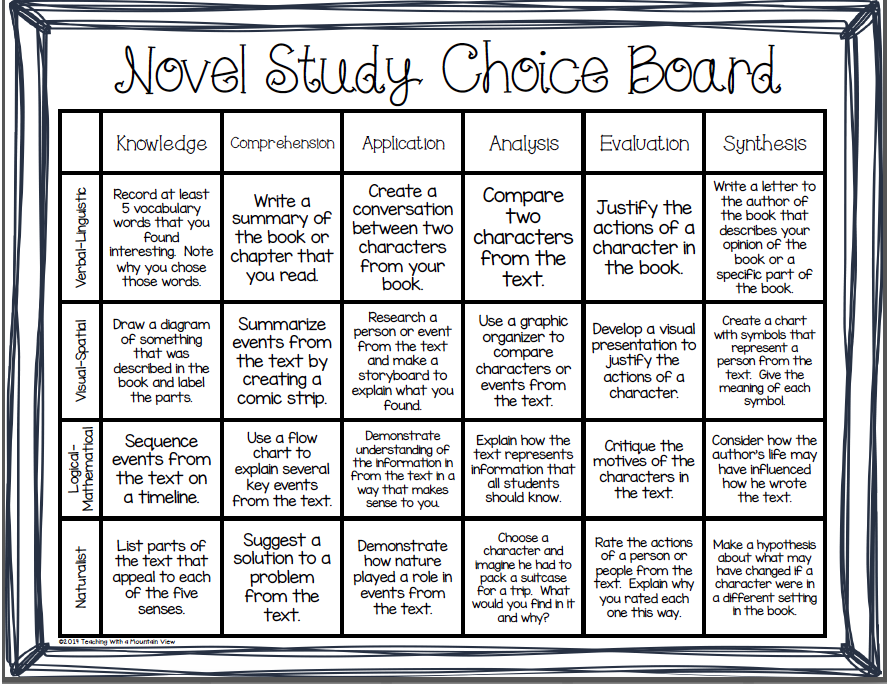 Ein schönes Beispiel für ein Lektüre-Choice Board (4./5. Klasse) lässt sich bei der US-Grundschullehrerin Brooke Germaine finden, die auf ihrem Blog „Mrs. Germaine’s Class“ ihre Arbeit mit zahlreichen Praxisbeispielen dokumentiert und Schüler-Materialien zur Verfügung stellt.